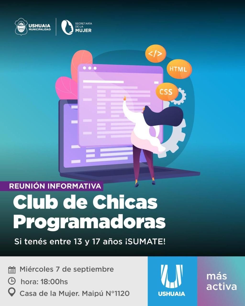 La Secretaría de la Mujer de la Municipalidad de Ushuaia, junto al Centro de Género en Tecnología dependientes de la Secretaría de Innovación Pública de la Jefatura de Gabinete de Ministerios del Gobierno Nacional, invitan a las chicas de entre 13 y 17 años a formar parte del “Club de Chicas Programadoras”, donde el miércoles 7, se realizará una reunión informativa en la Casa de la Mujer, ubicada en Maipú 1120.